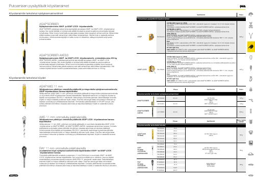 CE EN 12841 tyyppi A, UKCA OK TRIACT-LOCK -sulkurenkaan ja EN 1891 -standardin tyyppi A:n mukaisen 10 13 mm köyden kanssa käytettynä. Tarvittaessa voidaan käyttää ASAP SORBER- tai ASAP SORBER AXESS -nykäyksenvaimenninta. CE EN 353-2, UKCA OK TRIACT-LOCK -sulkurenkaan ja 11 mm ASAP AXIS -köyden kanssa käytettynä. Tarvittaessa voidaan käyttää ASAP SORBER- tai ASAP SORBER AXESS -nykäyksenvaimenninta. ANSI Z359.15 ASAP SORBER- tai ASAP SORBER AXESS -nykäyksenvaimentimen, Bm D- tai OXAN TRIACT-LOCK -sulkurenkaan (kansainvälinen versio), CAPTIV-asemointitangon ja joustamattoman, ommellulla päätöslenkillä varustetun RAY 11 mm -köyden kanssa käytettynä. EAC OK TRIACT-LOCK -sulkurenkaan ja EN 1891 -standardin tyyppi A:n mukaisen 10 13 mm köyden kanssa käytettynä. Tarvittaessa voidaan käyttää ASAP SORBER- tai ASAP SORBER AXESS -nykäyksenvaimenninta. XF 494 Light Use GB/T 24537 OK TRIACT-LOCK -sulkurenkaan sekä ASAP SORBER- tai ASAP SORBER AXESS -nykäyksenvaimentimen kanssa käytettynä.