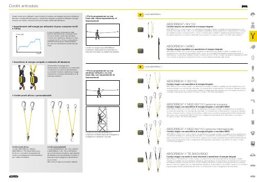 ABSORBICA®-Y 80/150 Cordino doppio con assorbitore di energia integrato ABSORBICA-Y è un cordino doppio, con assorbitore di energia compatto, progettato per la progressione su una struttura verticale o su una linea vita orizzontale, con superamento di frazionamenti. Funziona per utilizzatori di peso compreso tra 60 e 140 kg. Consente varie modalità di collegamento all imbracatura e può accogliere diversi tipi di connettori. Disponibile in due versioni: 80 (capi in corda) o 150 FLEX (capi elastici).